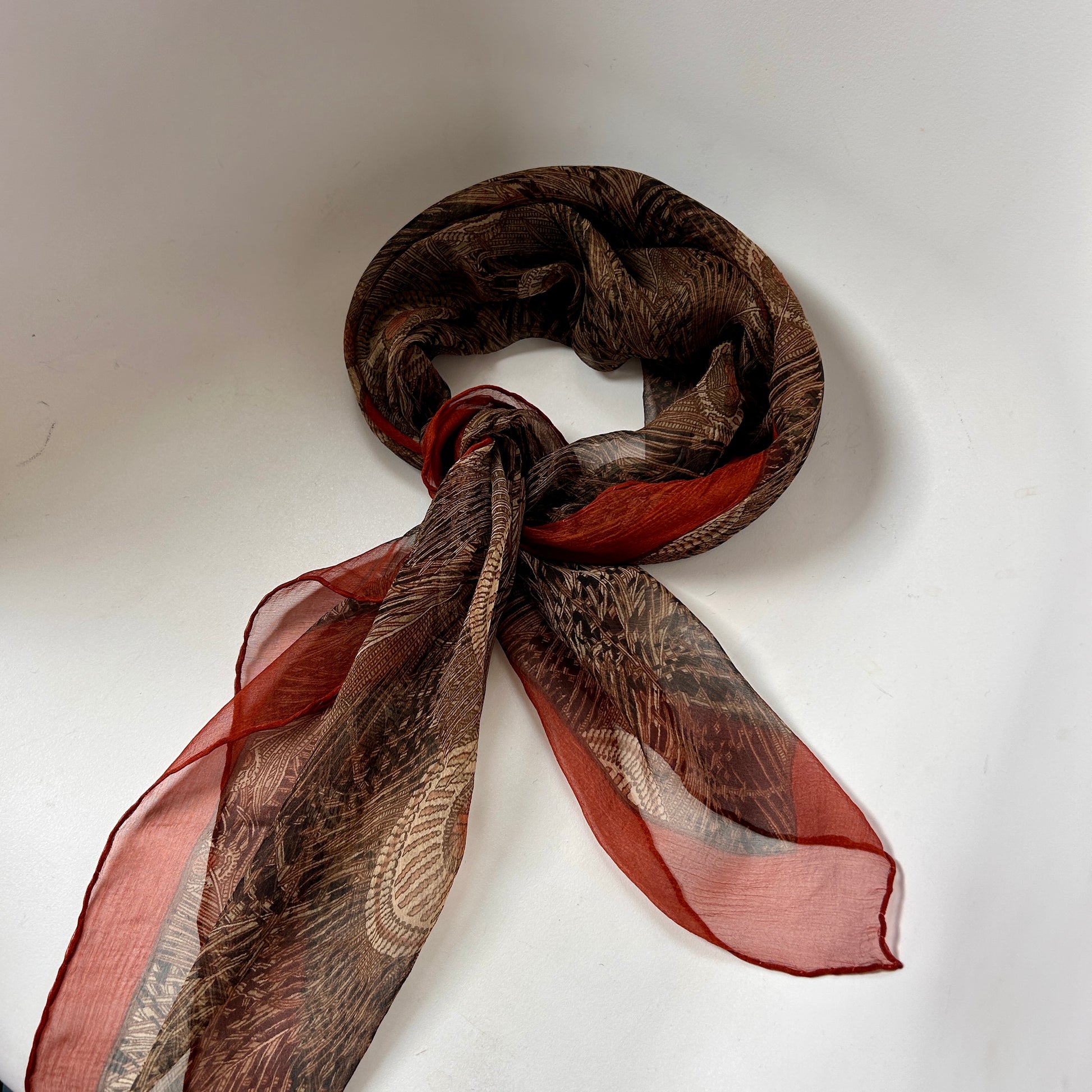 Warm brown and chocolate tones, square sheer scarf perfect for Autumn.