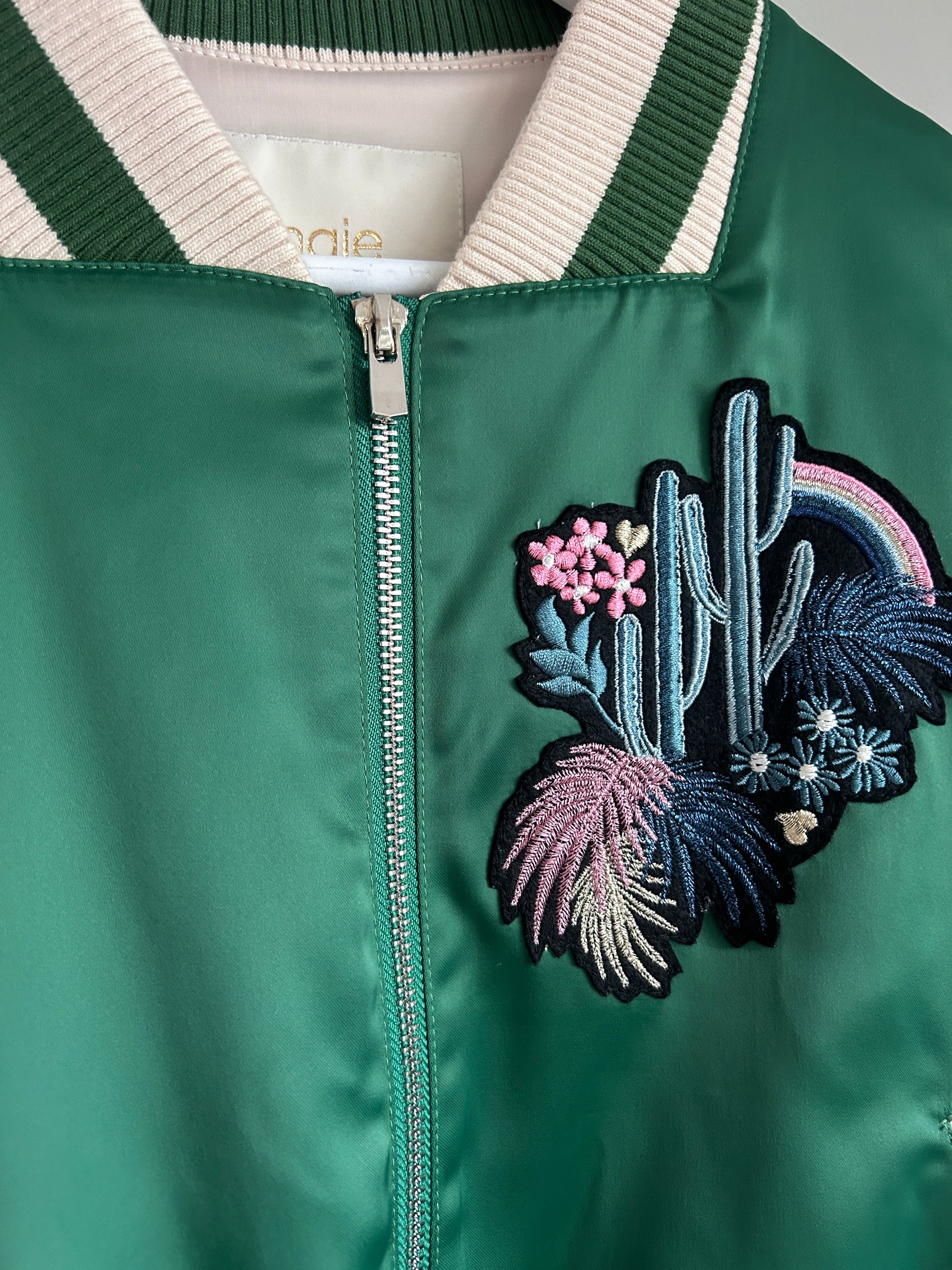 Pure Spring joy! Green satin with contrasting ivory on shoulders, neck and waist. Delightful cactus and floral embroidery on chest. Handy pockets.