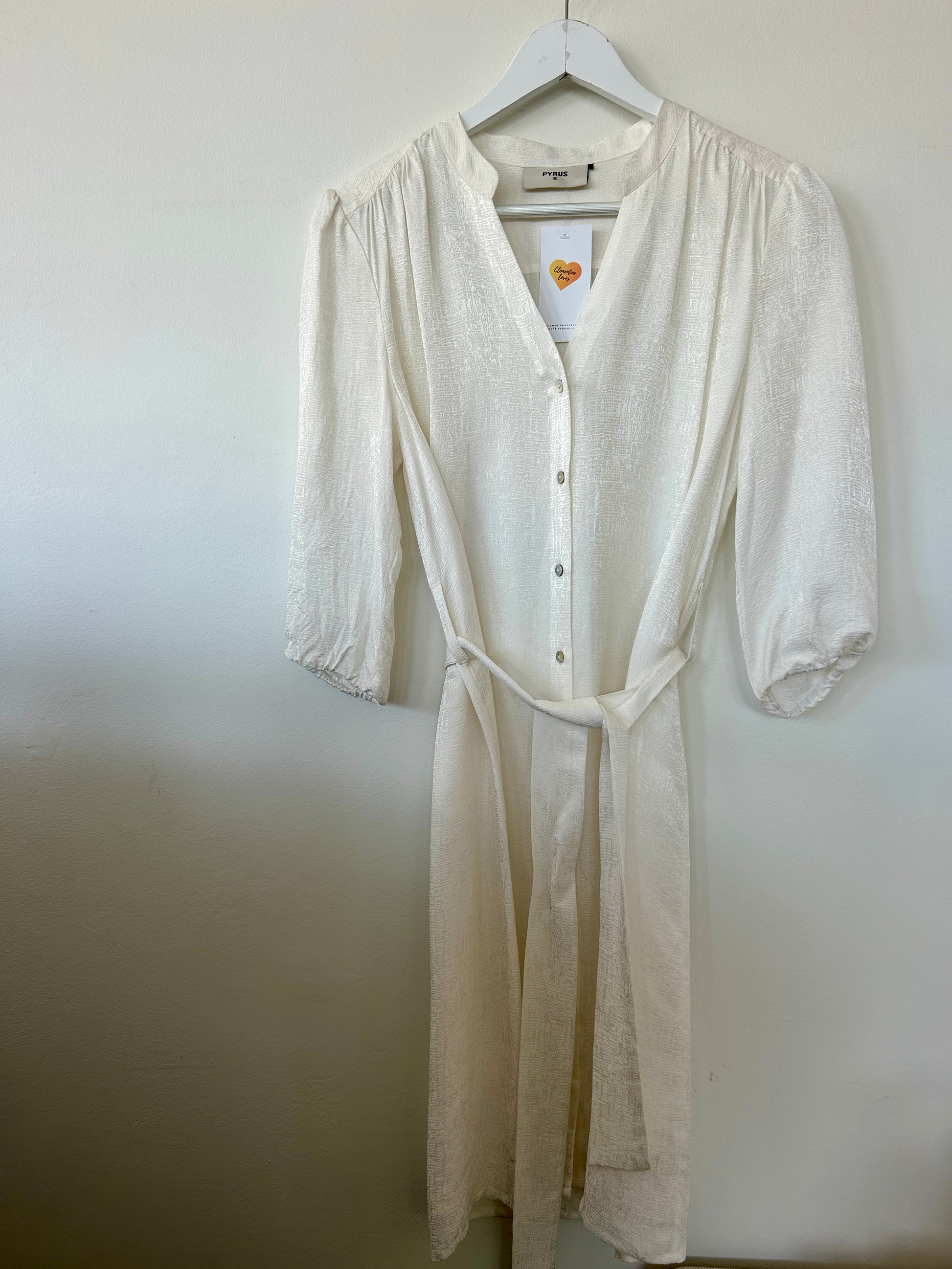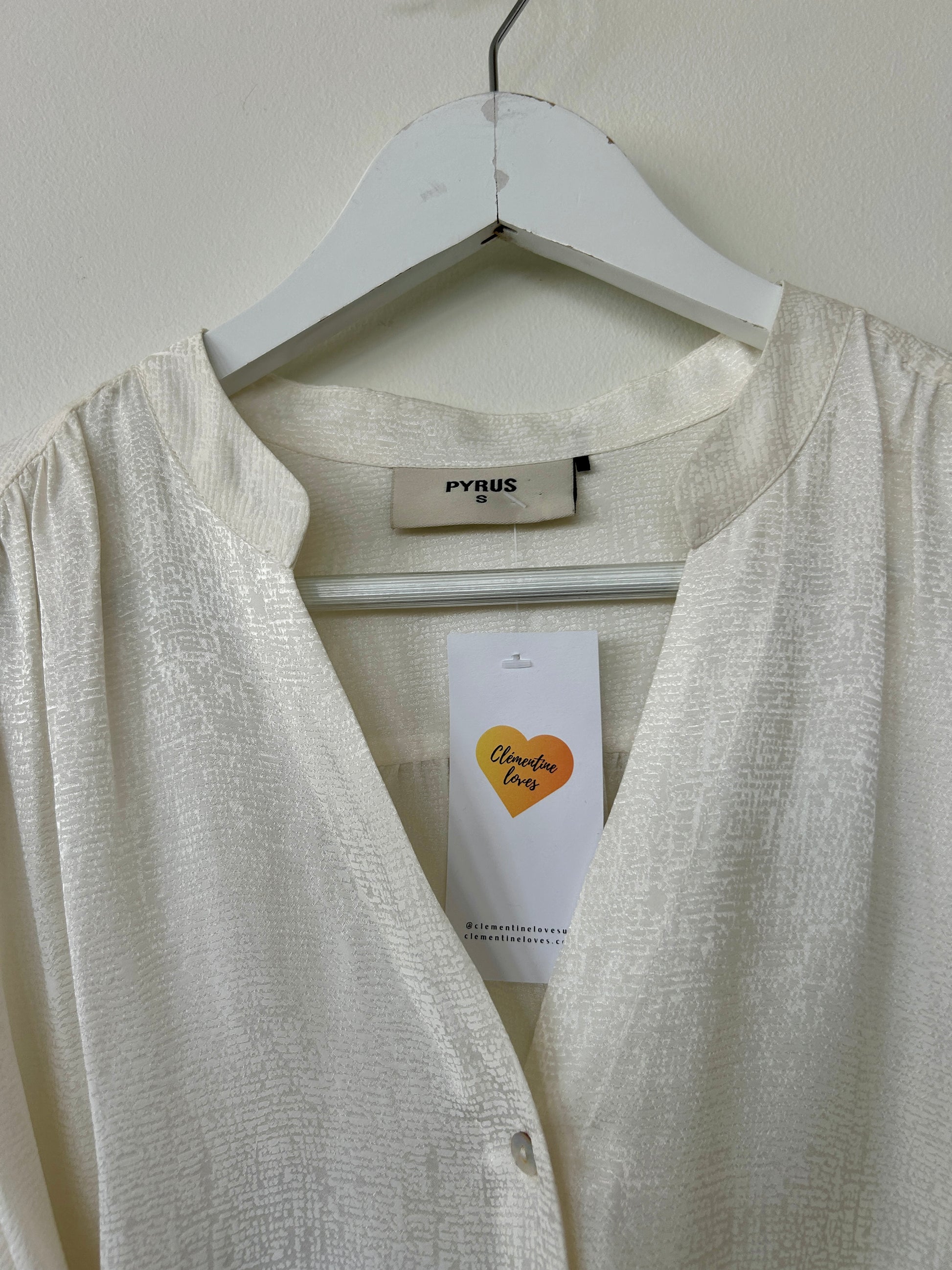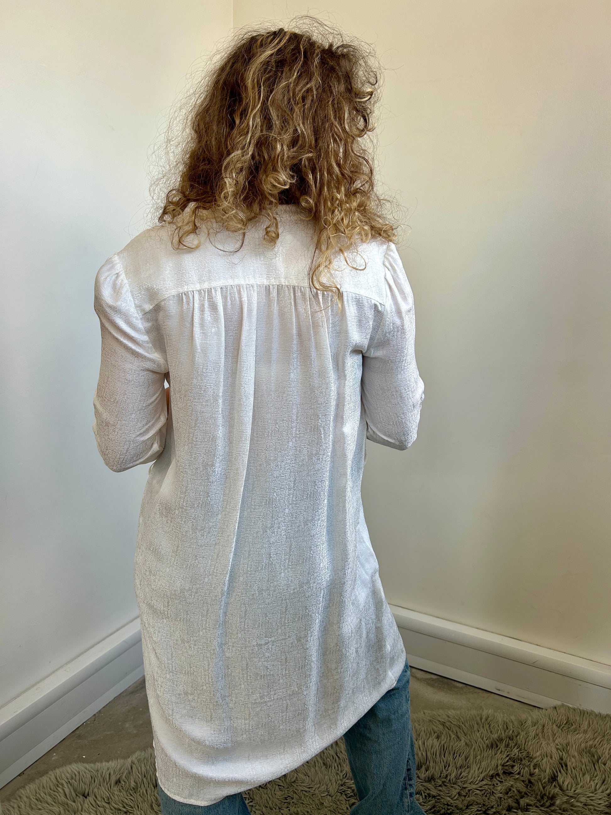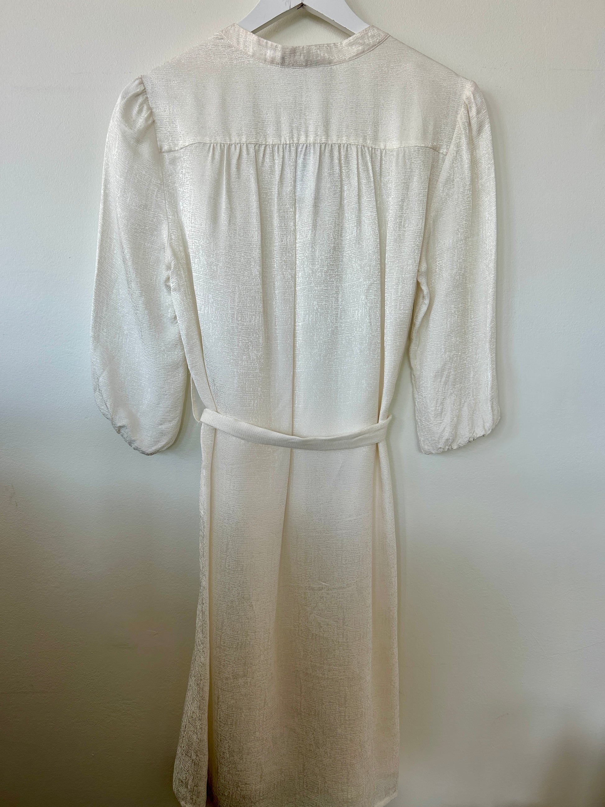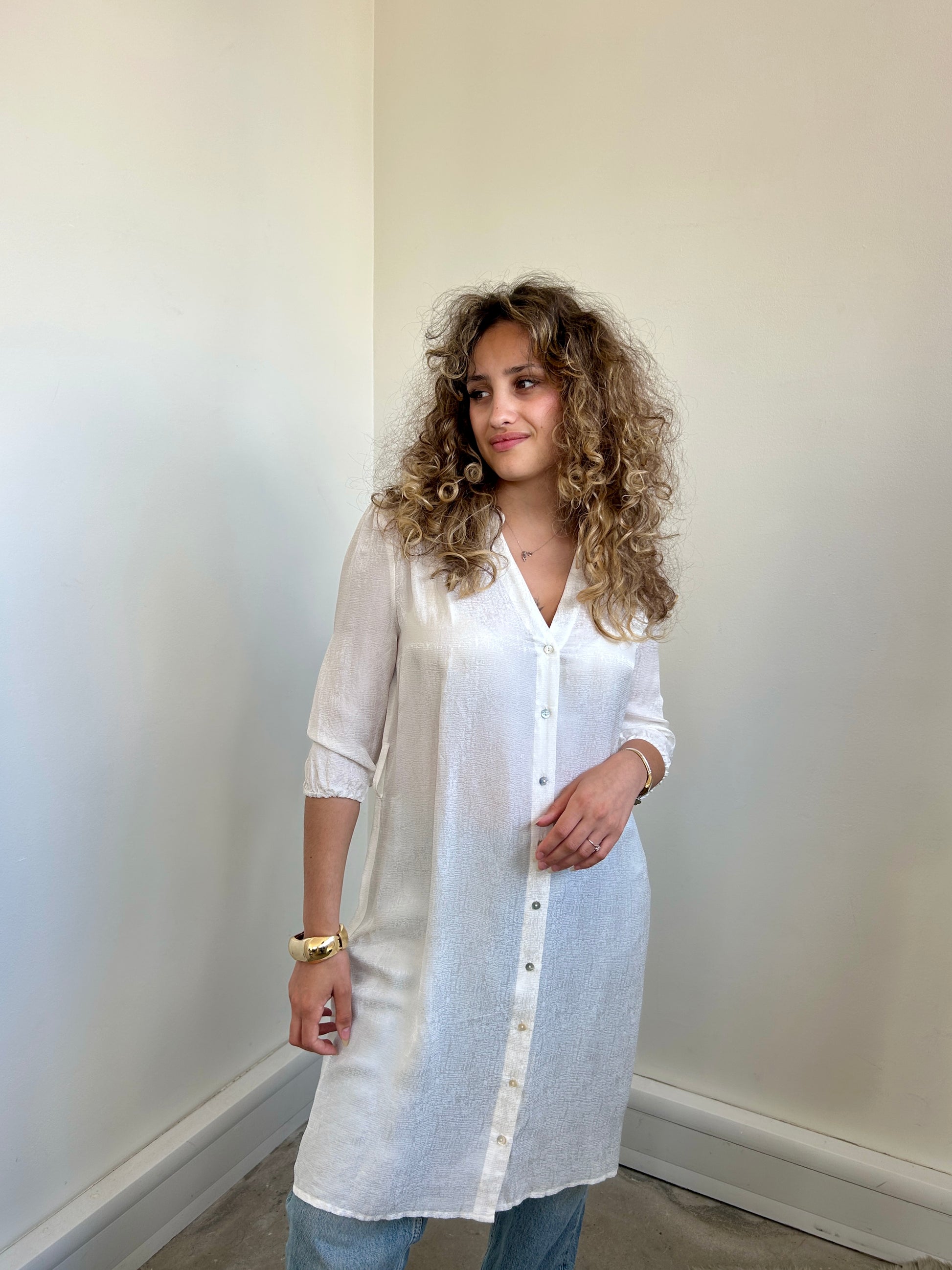 V neck, 3/4 sleeve, fabric tie. To be worn as a knee-length dress or tunic.