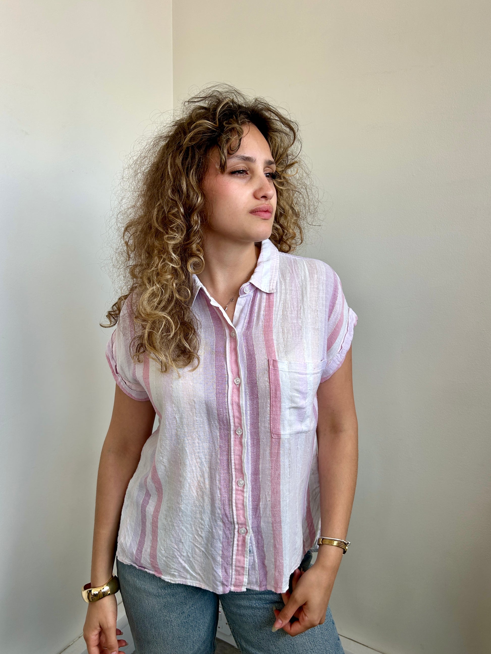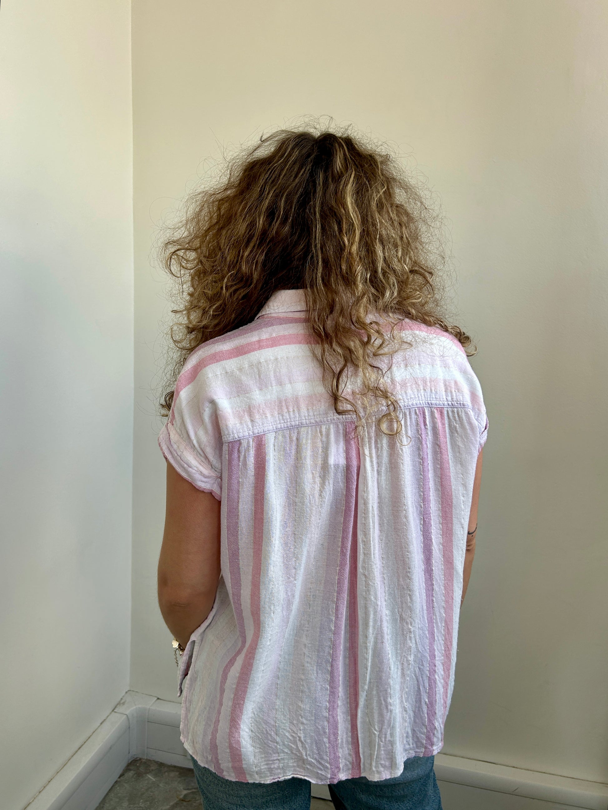 Whitney Sahara stripe shirt with gold thread running through the fibre.