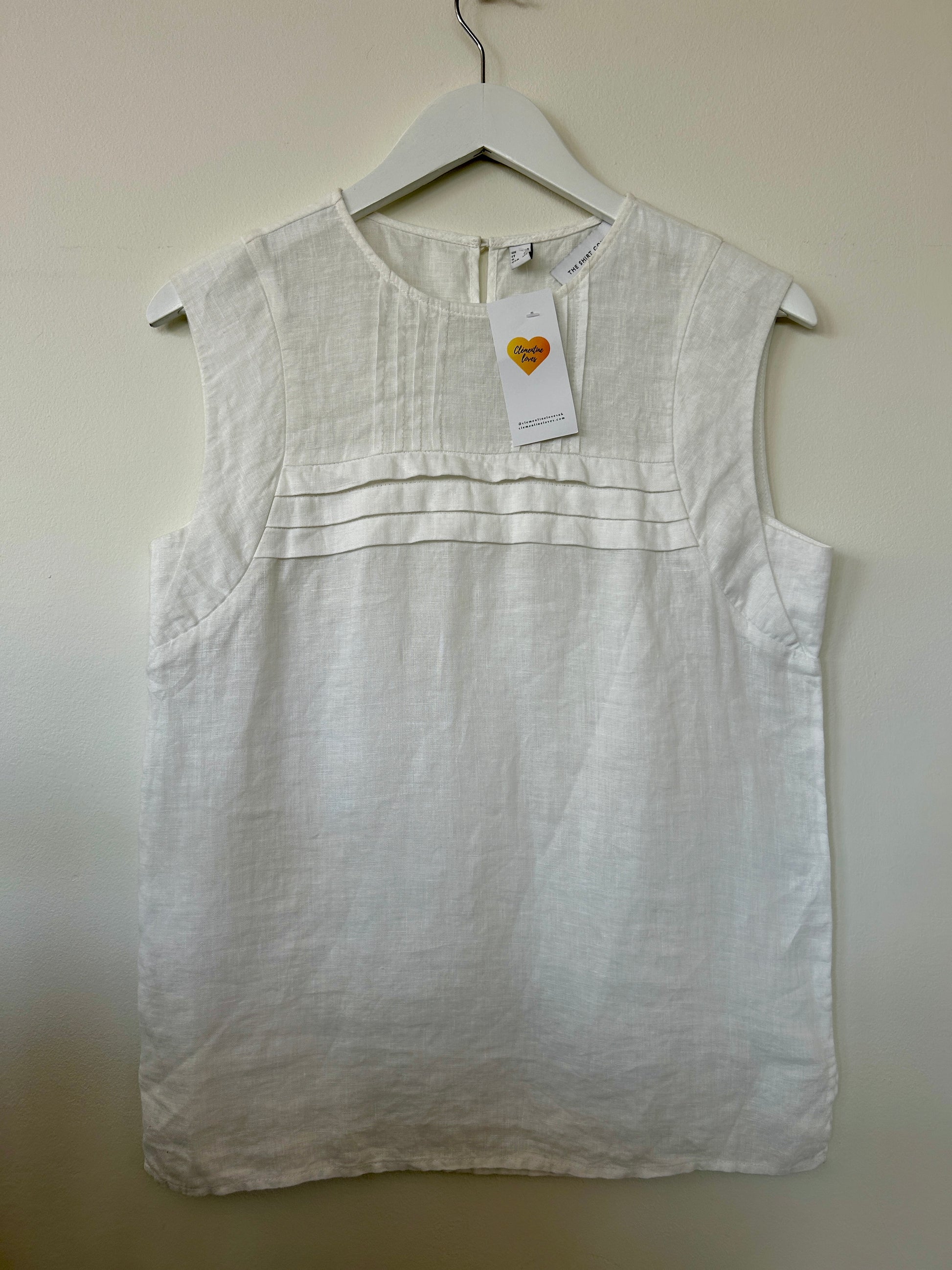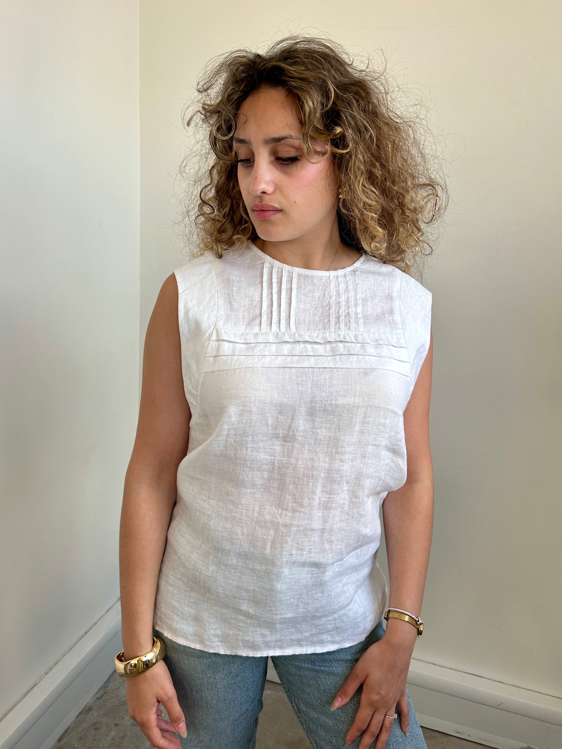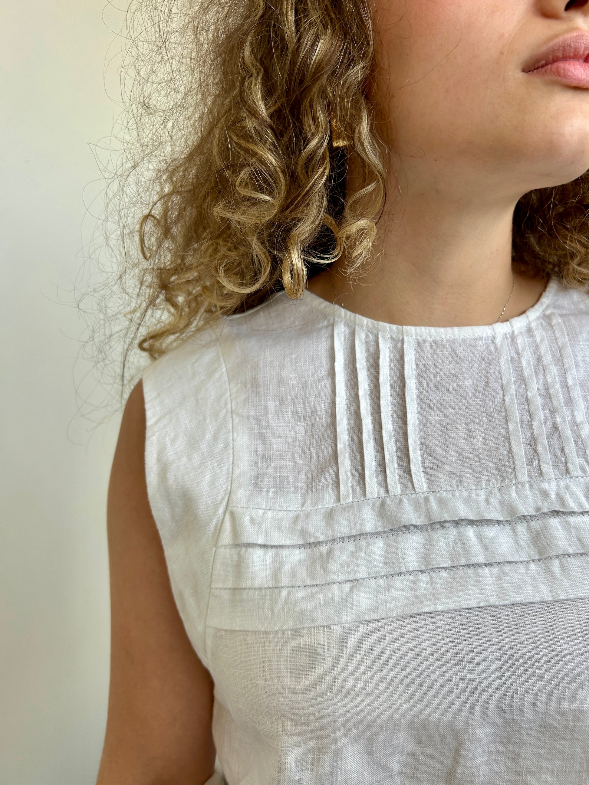 Delicate pleated detail on the front, button fastening at the back of the neck. Small side slits.