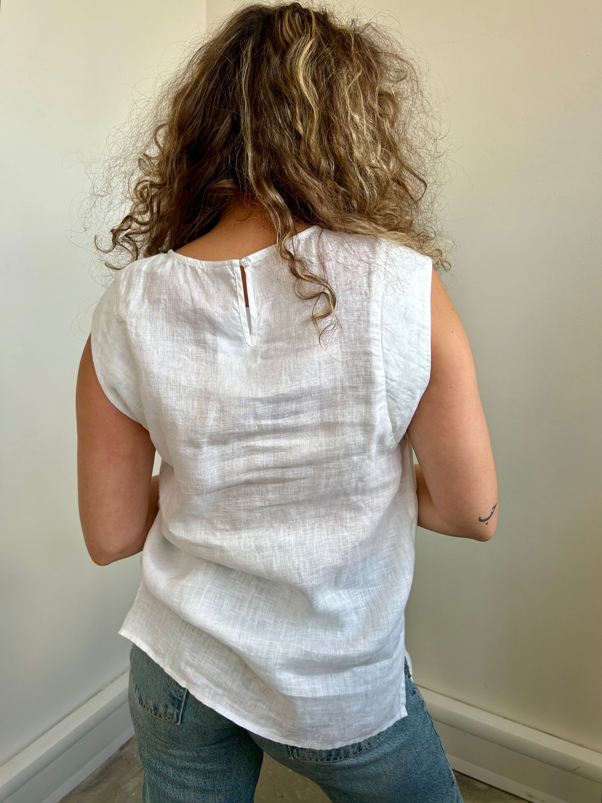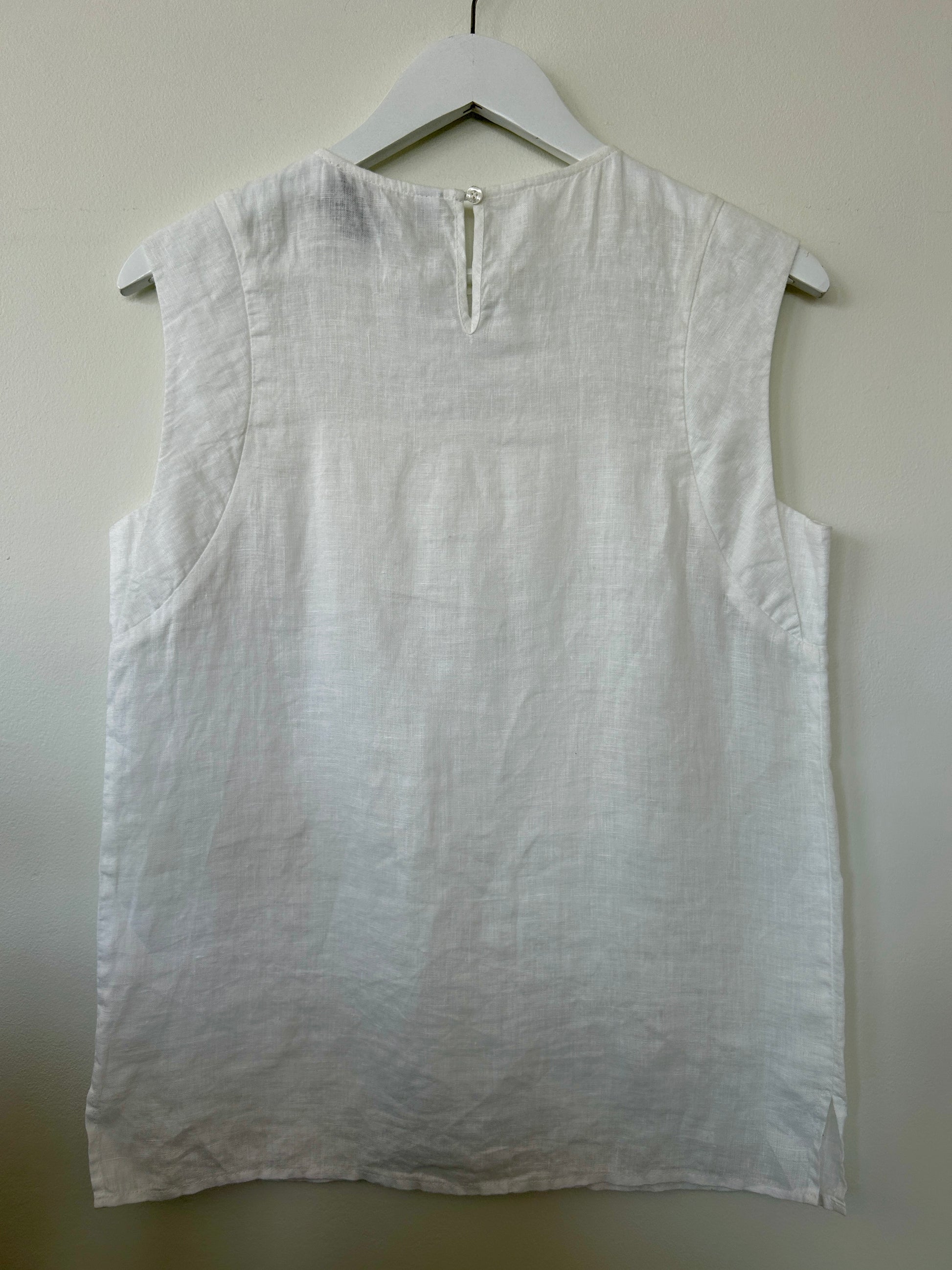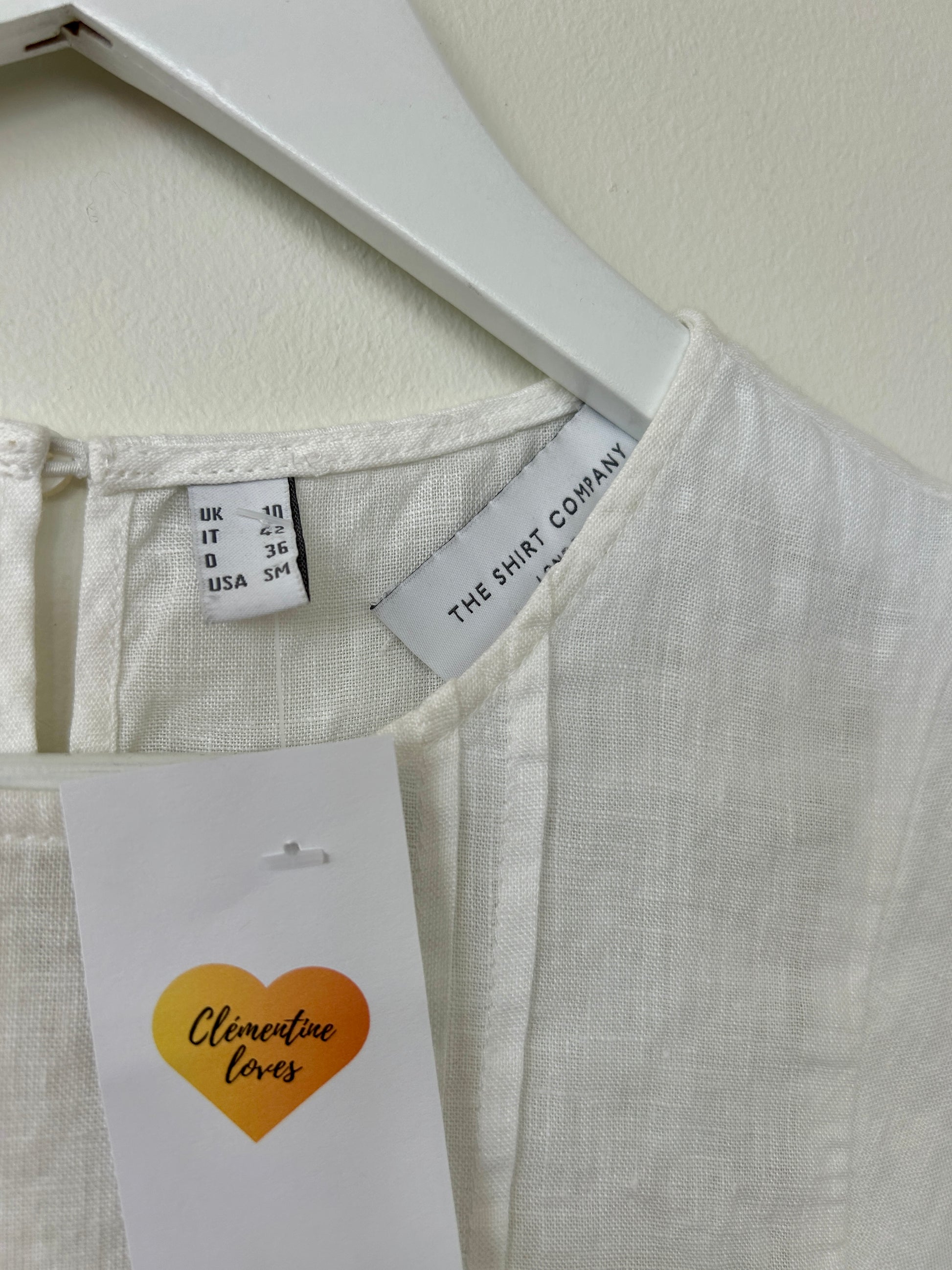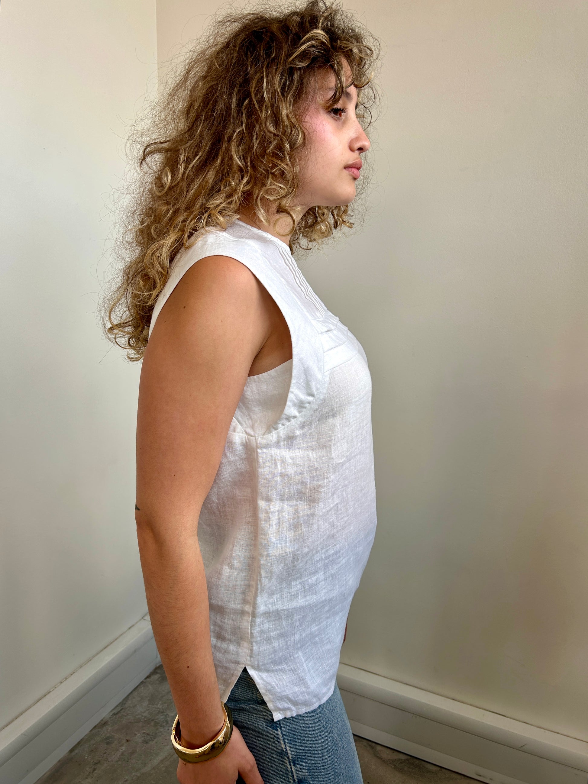 Delicate pleated detail on the front, button fastening at the back of the neck. Small side slits.